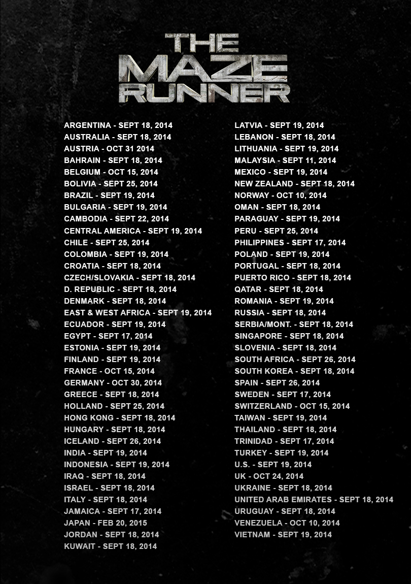 A film hivatalos facebook oldalán található képre hívja fel a figyelmet, ami nekünk is érdekes lehet. Itt is van az a bizonyos kép.Vagyis ha kinagyítjátok, akkor világosan látszik, hogy Az Útvesztő film magyar premierje 2014 szeptember 18-án lesz. Én nagyon örülök ennek a hírnek, hogy nem kell sokat várnunk az amerikai premier után.:)